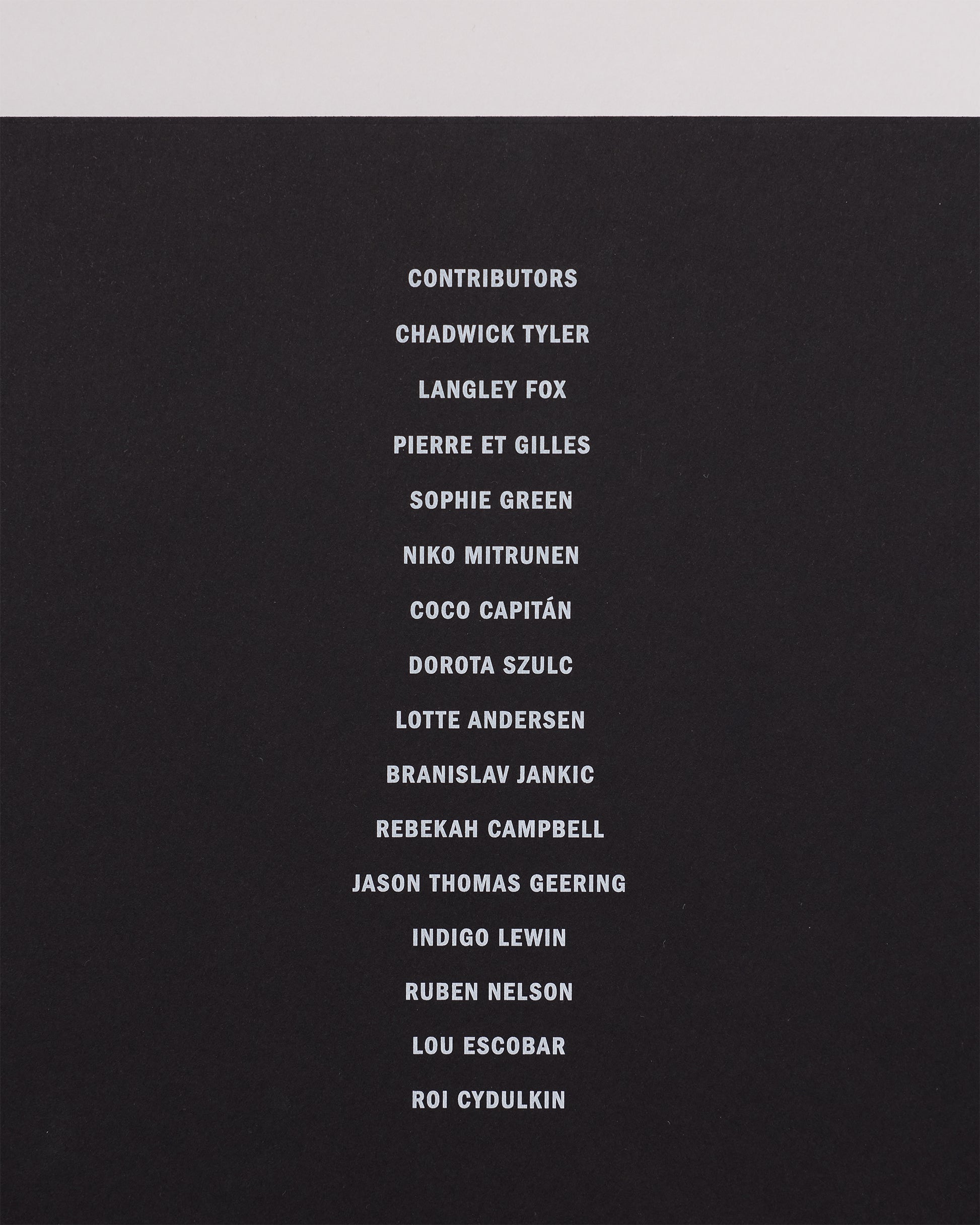 Issue 08 Contributors: Pierre & Gilles, Coco Capitan, Chadwick Tyler, Lotte Andersen, Indigo Lewin, Rebekkah Campbell, Branislav Jankich, Langley Fox, Sophie Green, Lou Escobar, Dorota Szulc, Jason Geering, Niko Mitrunen, Ruben Nelson and Roi Cydulkin.